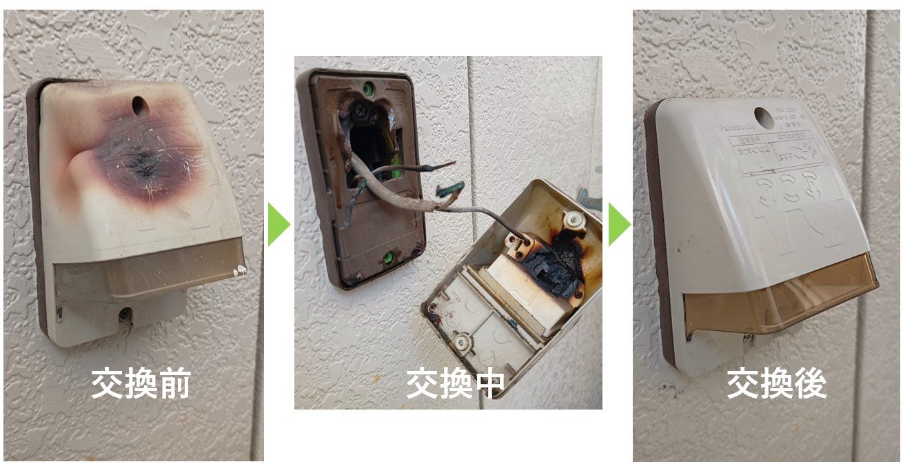 コンセント内外共に損傷が激しい状況でしたが、大事にならずに対応でき、「賃借人様・不動産会社様・オーナー様」にご安心いただけました。