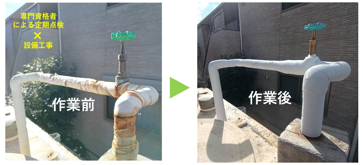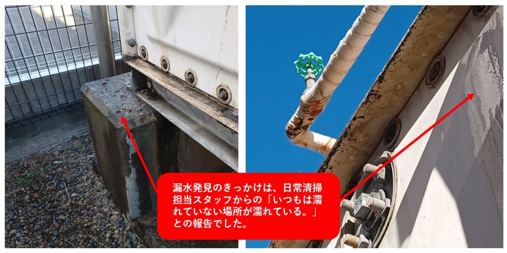 本工事につきましては、「弊社日常清掃スタッフ」の気づきが「電気・設備担当」に申し送りされ、漏水を発見、その後、対応工事に至った事例です。