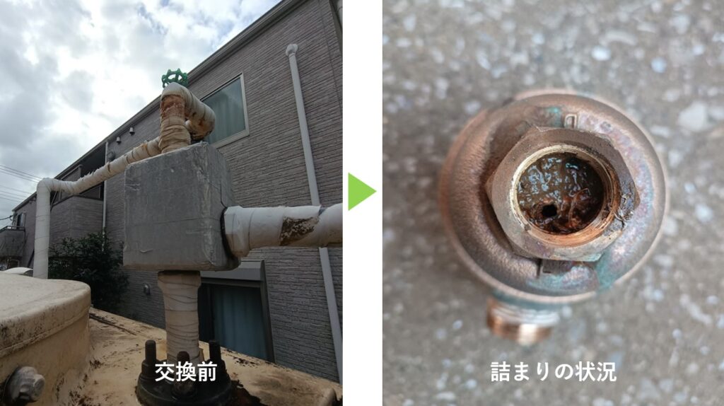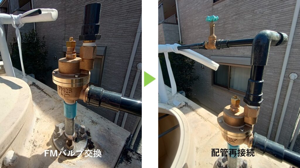 以前、漏水復旧工事を行った際に、FMバルブの状態を点検したところ、写真の通り詰まりが発生しており交換が必要な状況でしたので、弊社よりご提案させていただき、交換工事のご依頼をいただきました。